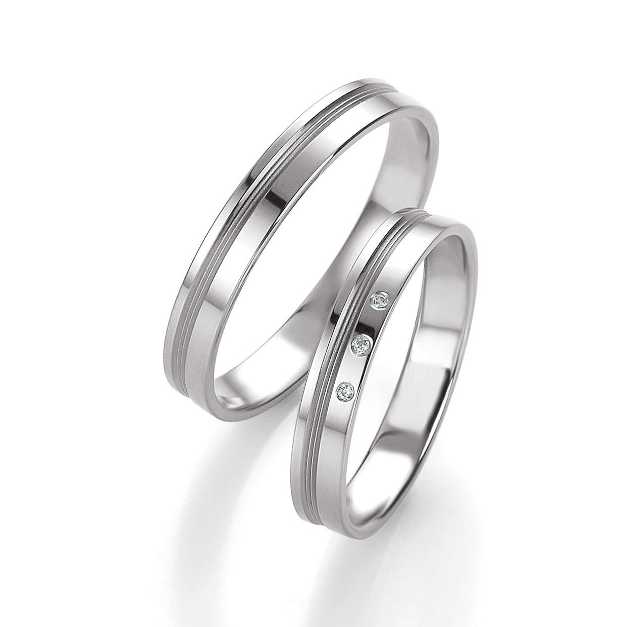 Paire d’alliances en or blanc 585/14 ct. ou 750/18 ct. poli / sablé fin. La largeur de l’anneau est de 3.5 mm et 3 diamants pour 0.017 ct. sur le modèle femme.