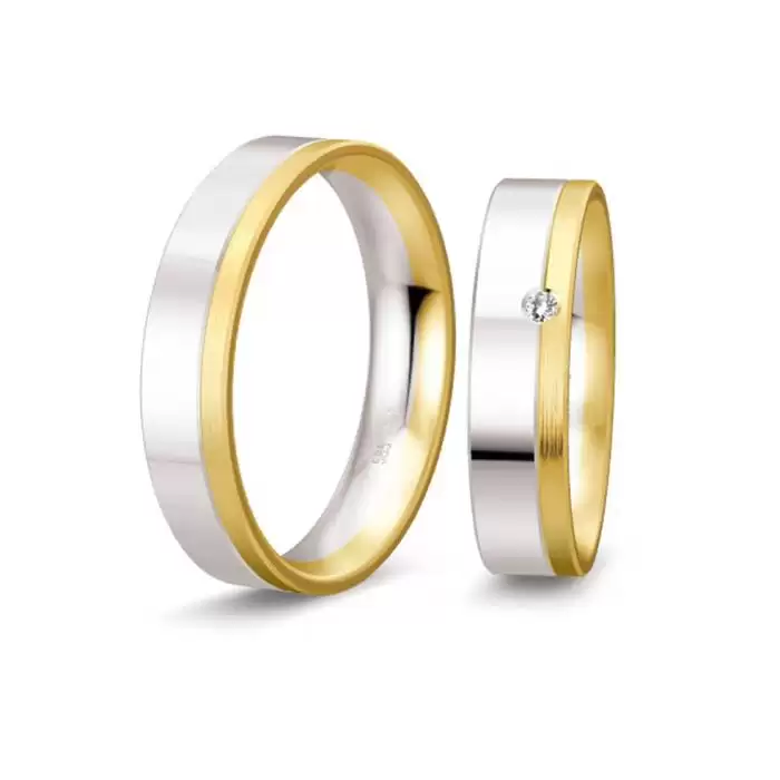 Paire d’alliances en or blanc et or jaune 585/14 carats ou 750/18 carats. La largeur de l’anneau est de 5.0 mm et diamant de 0.02 carat sur le modèle femme.