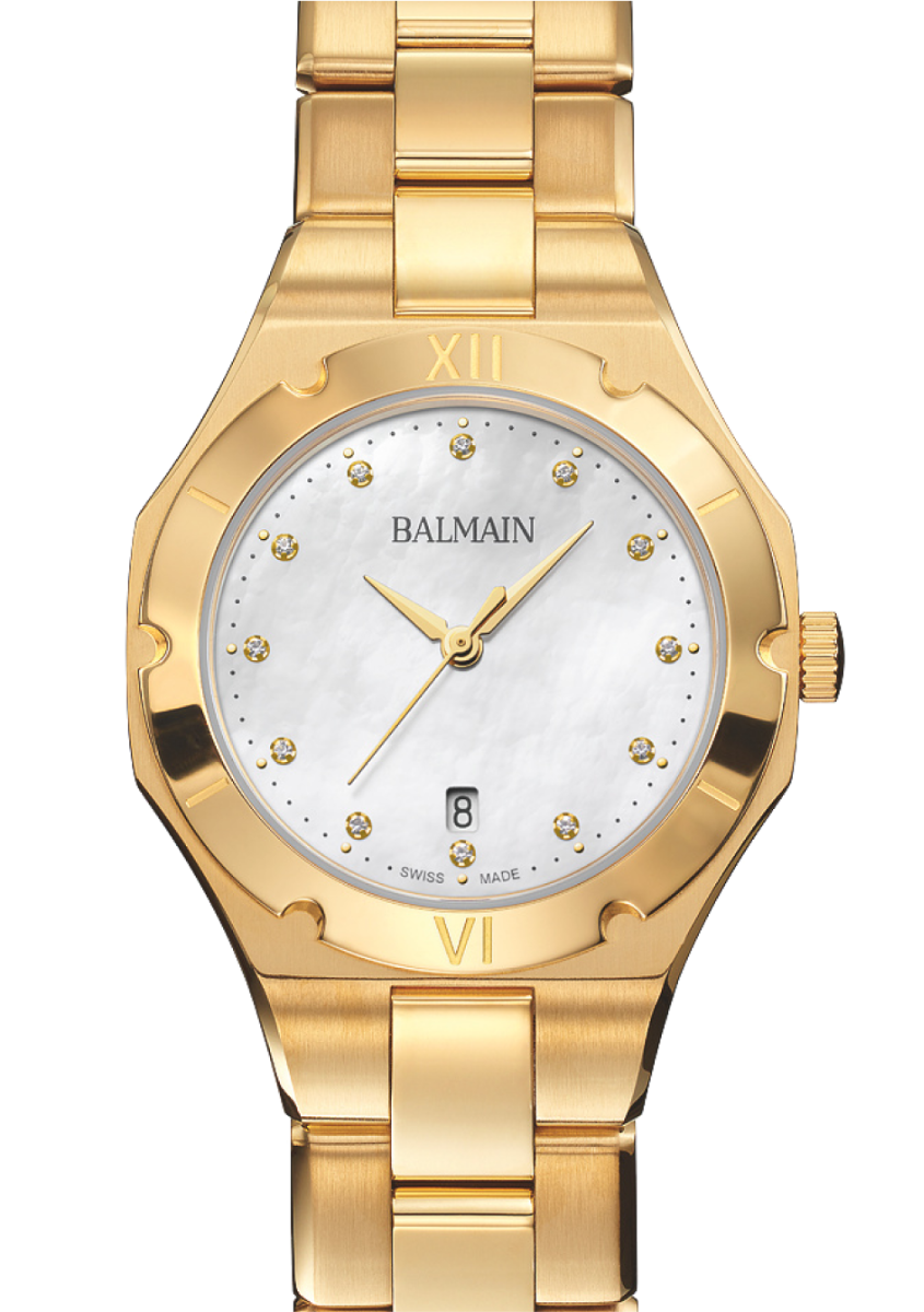 Die Balmain Be Balmain ist eine anspruchsvolle Damenuhr, die zarte Eleganz mit einem modernen Design verbindet, das von der Pariser Haute Couture inspiriert wurde. Das Zifferblatt aus weißem Perlmutt ist mit 12 Top Wesselton VS-SI Diamanten von insgesamt 0,043 Karat besetzt und verfügt über Diamantziffern. Das 31 mm Gelbgold PVD Gehäuse mit einem schlanken Profil von 7,65 mm und das passende Armband bieten einen zeitlosen Stil für den Alltag. Dieser Zeitmesser aus Schweizer Produktion ist mit einem Saphirglas ausgestattet.