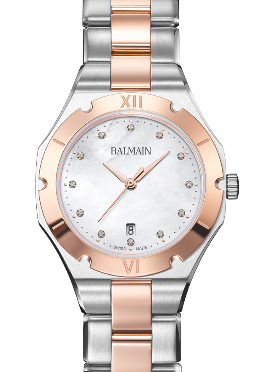 Die Balmain Be Balmain ist eine raffinierte Damenuhr, die kühne Eleganz mit einem modernen Design verbindet, das von der Pariser Haute Couture inspiriert ist. Das Zifferblatt aus weißem Perlmutt ist mit 12 Top Wesselton VS-SI Diamanten von insgesamt 0,043 Karat besetzt und verfügt über Diamantziffern. Das 31 mm Gehäuse aus zweifarbigem Edelstahl und PVD Roségold mit einem robusten 7,65 mm Profil und einem passenden Armband bietet einen zeitlosen Stil für den Alltag. Dieser in der Schweiz hergestellte Zeitmesser ist mit einem Saphirglas ausgestattet.
