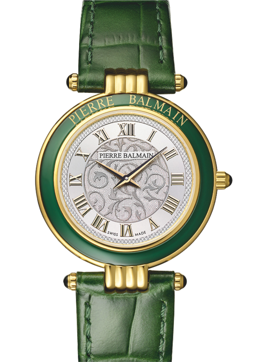 Die Balmain Haute Élégance ist eine elegante Damenuhr, die einen hellen Stil mit einem modernen Design verbindet, das von der Pariser Haute Couture inspiriert ist. Auf der dunkelgrünen Lünette ist „Pierre Balmain“ eingraviert. Das weiße Zifferblatt mit Arabesken und klassischen römischen Ziffern verleiht der Uhr einen femininen Touch. Das zweifarbige 30 mm Edelstahlgehäuse mit einer dunkelgrünen Lünette, einem anmutigen 4,82 mm Profil und einem grünen Lederarmband bietet Raffinesse für den Alltag. Dieser in der Schweiz hergestellte Zeitmesser ist mit einem Saphirglas ausgestattet.