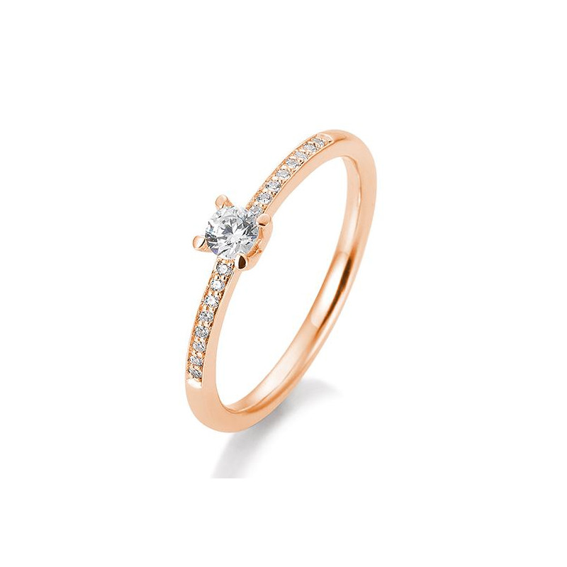 Solitärring aus Rotgold 750/18 kt. mit einem zentralen Diamanten von 0,15 ct. H SI, 4 Krappen, insgesamt 0,23 ct. H SI