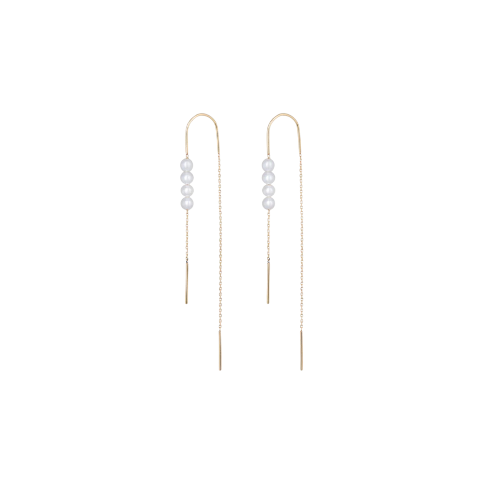 Diese Ohrringe sind vom himmlischen Tanz inspiriert und zeigen eine anmutige Anordnung von vier glänzenden Perlen, die sanft an einer Kette aus 18 Karat Gold aufgehängt sind und eine Kaskade himmlischer Schönheit schaffen.