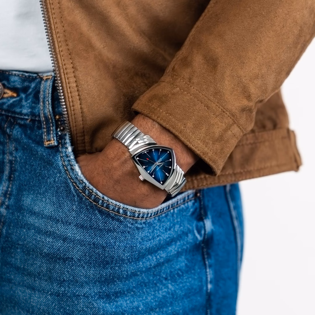 1957 brachte Hamilton die erste elektrische Uhr, die Ventura, auf den Markt. Diese revolutionäre Uhr markiert den Beginn einer neuen Ära in der Welt der Uhrmacherei und ist ein Emblem für futuristisches Design und ein Symbol für Innovation. Inspiriert von Elvis Presleys Hit Blue Suede Shoes ist die Ventura Quartz mit vernickelten Stunden-, Minuten- und Sekundenzeigern ausgestattet und verfügt über ein Quarzwerk für hohe Zuverlässigkeit. Das dunkelblaue Zifferblatt erinnert an die berühmten Schuhe des King, von denen in dem Lied die Rede ist.