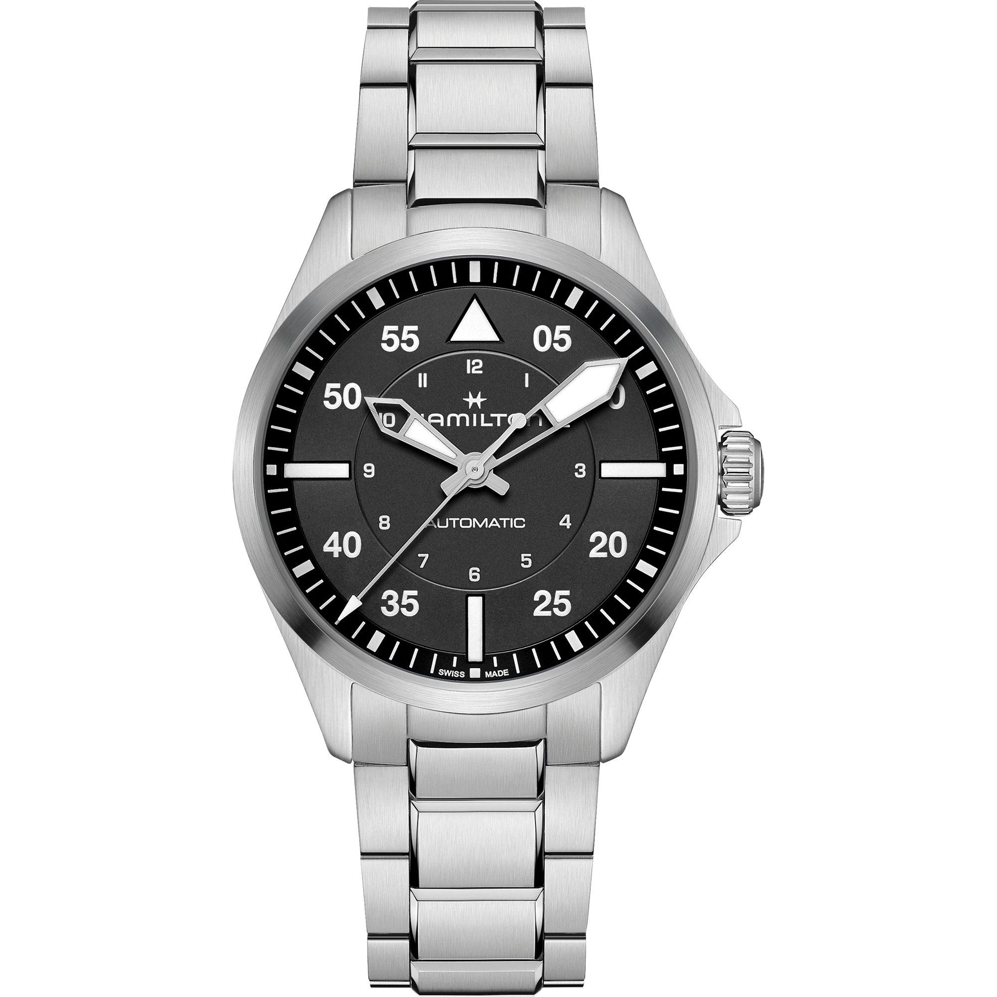 Die Khaki Aviation Pilot ist für echte Flugbegeisterte bestimmt und erinnert an den Entdecker- und Abenteuergeist der Khaki. Angetrieben wird sie von dem Automatikwerk H-10 mit einer Gangreserve von 80 Stunden und einer Nivachron™-Spiralfeder. Die Khaki Aviation 39 mm hat ein Armband aus poliertem und gebürstetem Edelstahl und ein komplett schwarzes Zifferblatt.