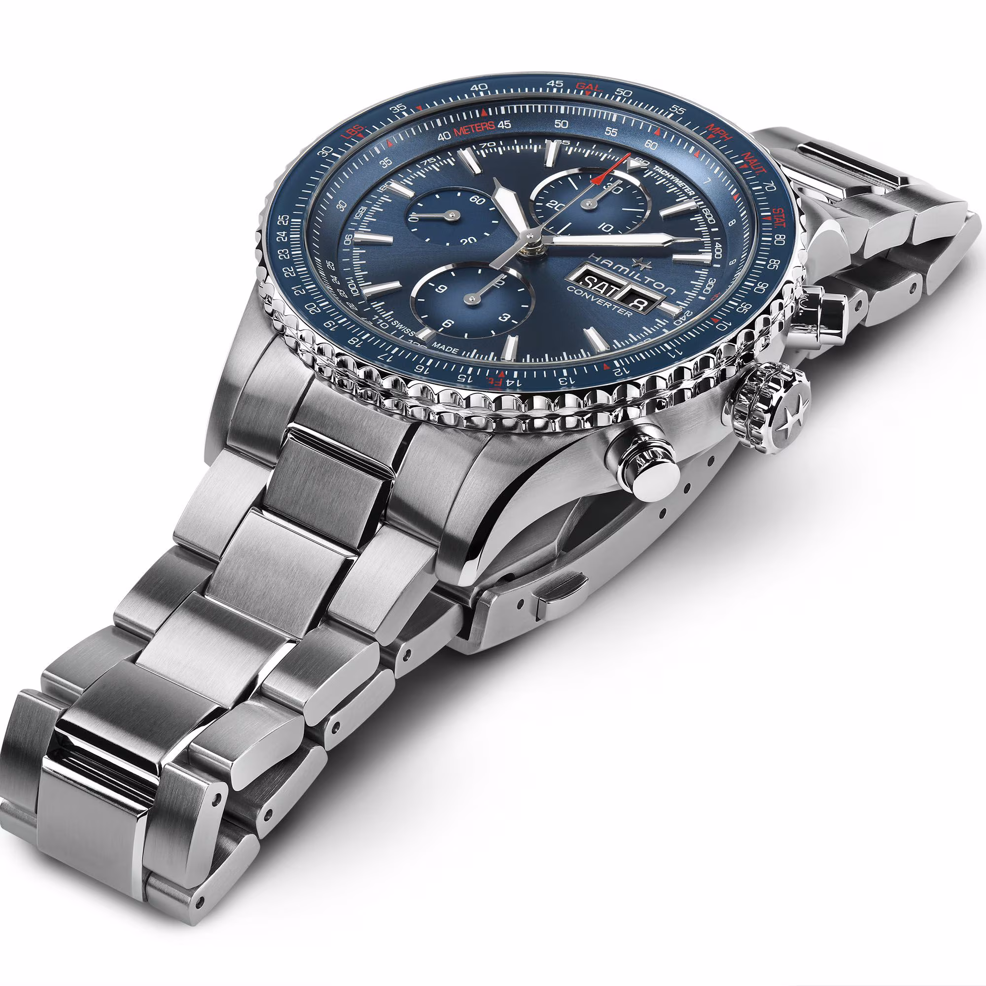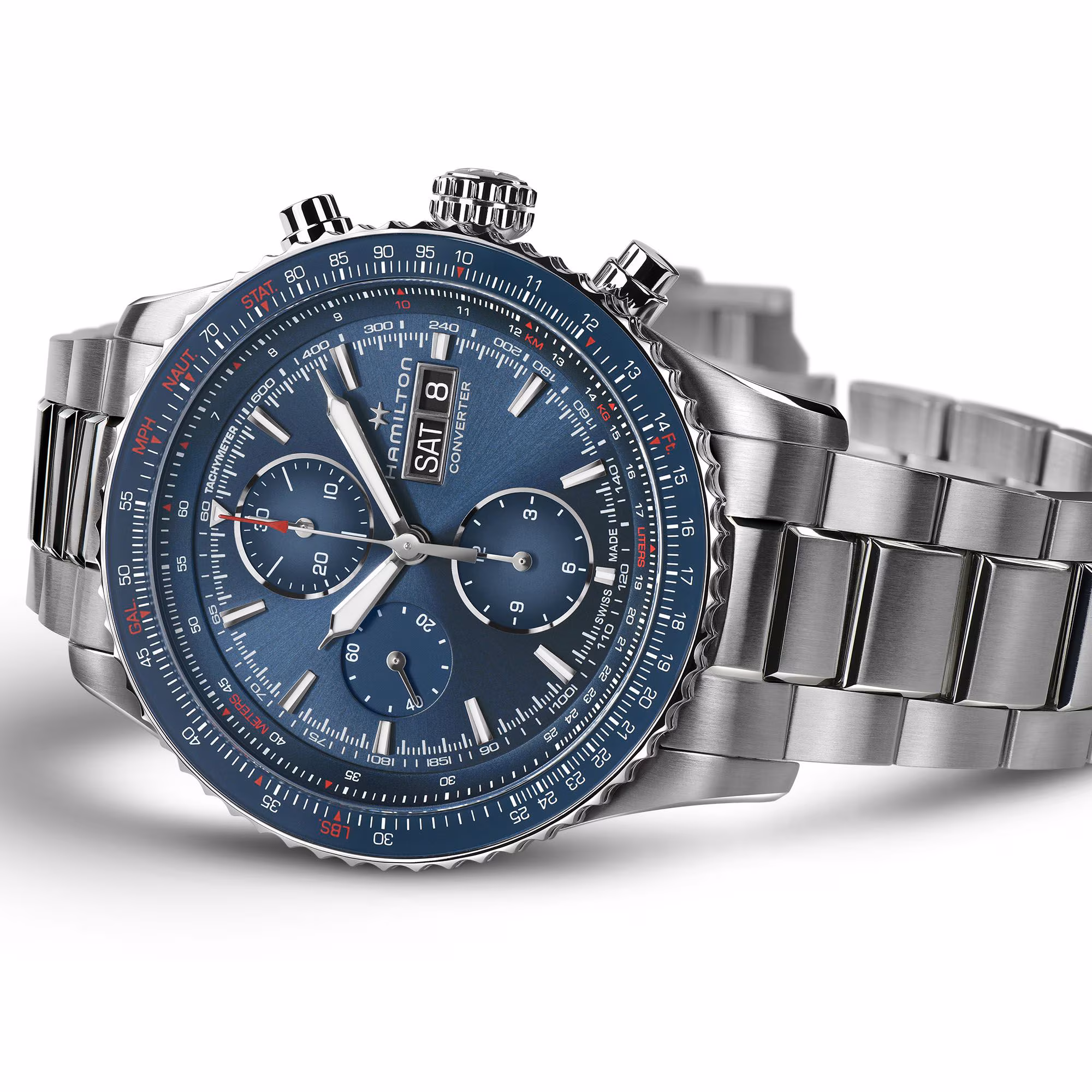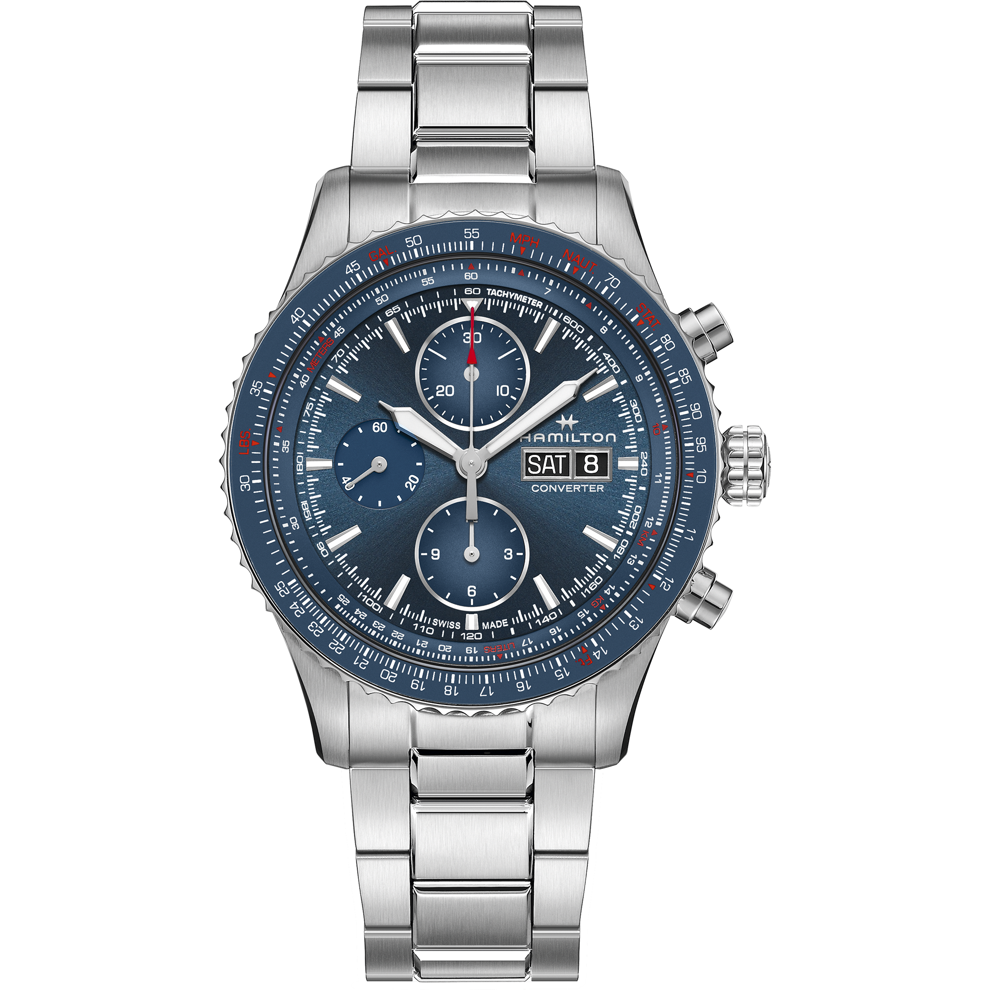Durchkreuzen Sie den Himmel mit unserer Khaki Aviation Converter Auto Chrono, die mit einer bidirektionalen, drehbaren Rechenschieberlünette ausgestattet ist, mit der Sie wichtige Operationen und Umrechnungen auf einen Blick durchführen können. Ausgestattet mit dem H-21-Si Uhrwerk mit Silizium-Spiralfeder für verbesserte Leistung und Präzision, verbindet diese Fliegeruhr Funktionalität und Luftfahrtästhetik in Perfektion: Das 44 mm Edelstahlgehäuse wird von einem Edelstahlarmband und einem blauen Zifferblatt begleitet, das an die Farbe eines klaren Himmels erinnert.