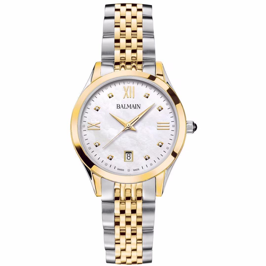 Die Balmain Classic R ist eine raffinierte Damenuhr, die kühne Eleganz mit einem modernen Design verbindet, das von der Pariser Haute Couture inspiriert ist. Das Zifferblatt aus weißem Perlmutt, besetzt mit acht Top Wesselton VS-SI Diamanten von insgesamt 0,030 Karat, und die klassischen römischen Ziffern verleihen der Uhr eine künstlerische und vibrierende Note. Das zweifarbige 34 mm Edelstahl- und Gelbgold-PVD-Gehäuse mit seinem raffinierten 6,80 mm Profil und dem passenden Armband bietet Eleganz für den Alltag. Dieser in der Schweiz hergestellte Zeitmesser ist mit einem Saphirglas ausgestattet.