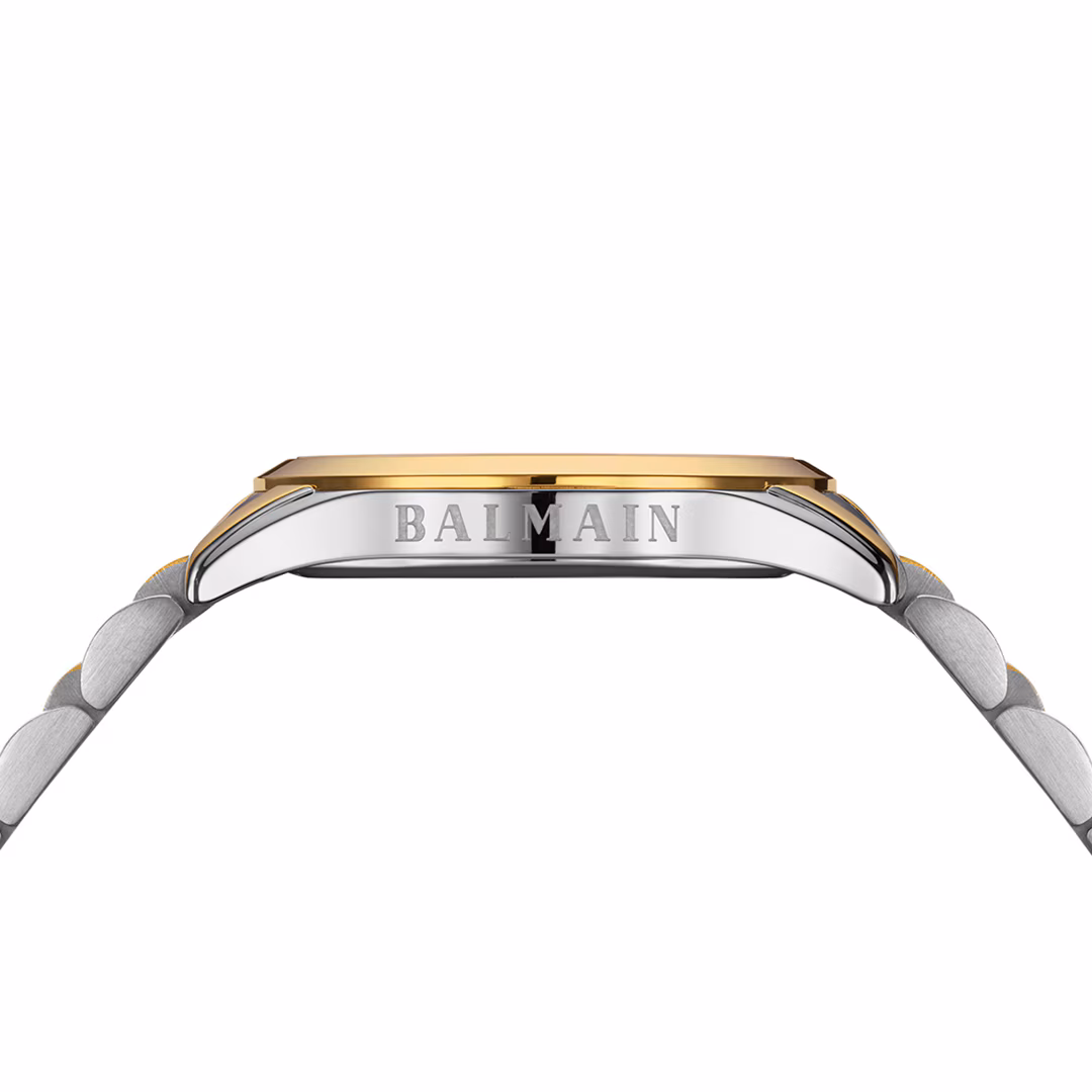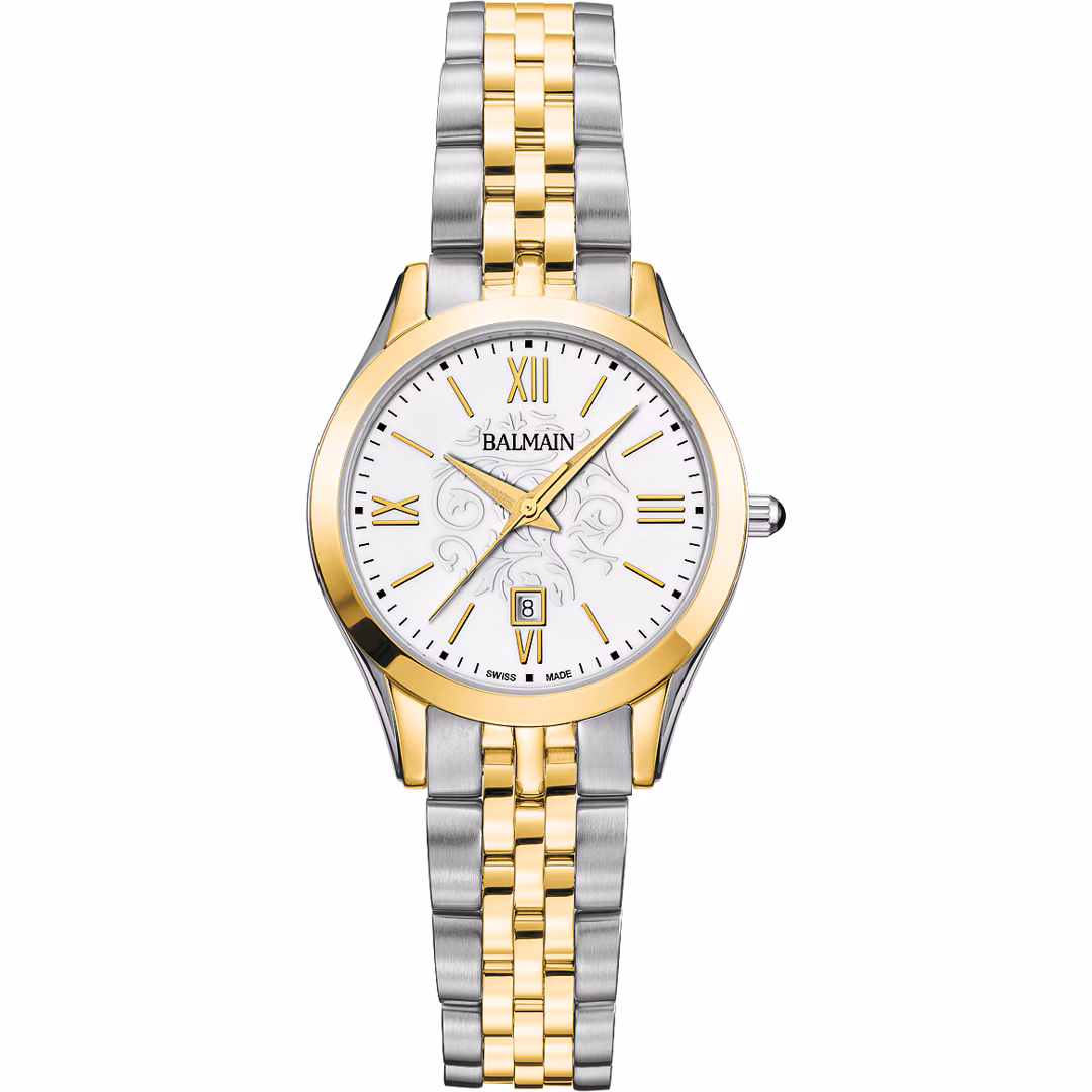 Die Balmain Classic R ist eine anmutige Damenuhr, die strahlende Eleganz mit einem modernen Design verbindet, das von der Pariser Haute Couture inspiriert ist. Das weiße Arabesken-Zifferblatt und die klassischen römischen Ziffern verleihen ihr einen selbstbewussten und raffinierten Touch, während das zweifarbige 30 mm Gehäuse aus Edelstahl und Gelbgold PVD, das schlanke 6,50 mm Profil und das passende Armband für Raffinesse im Alltag sorgen. Dieser Zeitmesser aus Schweizer Produktion ist mit einem Saphirglas ausgestattet.
