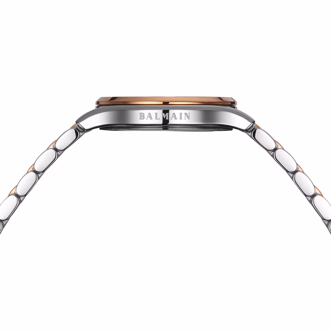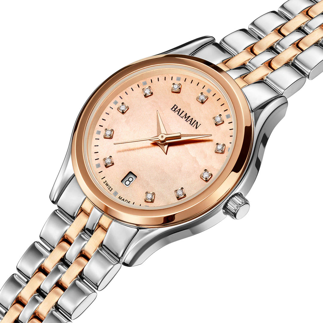 Die Balmain Beleganza ist eine anspruchsvolle Damenuhr, die kühne Eleganz mit einem modernen Design verbindet, das von der Pariser Haute Couture inspiriert wurde. Das Zifferblatt aus rosa Perlmutt ist mit 11 Top Wesselton VS-SI Diamanten von insgesamt 0,041 Karat besetzt und verfügt über Diamantindizes, die ihm einen ausdrucksstarken Touch verleihen. Das 27,50 mm große, zweifarbige Gehäuse aus Edelstahl und PVD-Rotgold mit einem robusten 6,40 mm Profil und das passende zweifarbige Armband sorgen für Eleganz im Alltag. Dieser in der Schweiz hergestellte Zeitmesser ist mit einem Saphirglas ausgestattet.