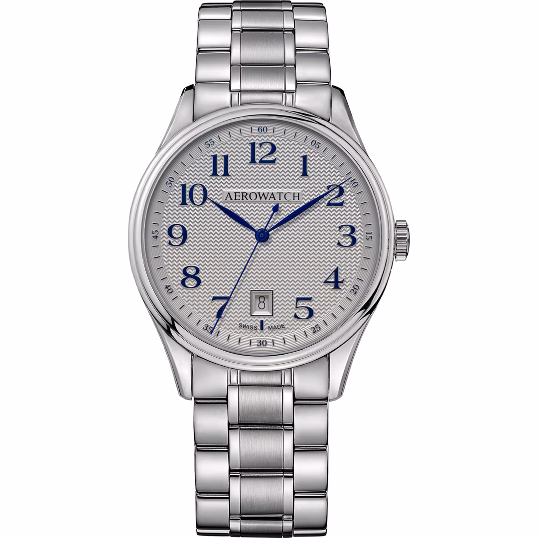 In dieser eleganten Version zeichnet sich die Aerowatch Les Grandes Classiques durch ihr silbernes guillochiertes Zifferblatt aus. Mit einem Durchmesser von 40 mm ist diese Herrenuhr ideal proportioniert und passt perfekt an jedes Handgelenk. Das stilvolle Zifferblatt ermöglicht ein klares und einfaches Ablesen der Zeit und unterstreicht so die zeitlose Eleganz der Uhr. Das Stahlarmband rundet das Design harmonisch ab und verleiht der Uhr ein klassisches und warmes Aussehen. Ein kratzfestes und entspiegeltes Saphirglas schützt das Zifferblatt vor alltäglichen Beschädigungen und garantiert eine optimale Sichtbarkeit bei allen Lichtverhältnissen. Die Aerowatch Les Grandes Classiques vereint erstklassige Handwerkskunst mit exquisitem Design und ist das perfekte Accessoire für Männer, die Wert auf Stil und Qualität legen.