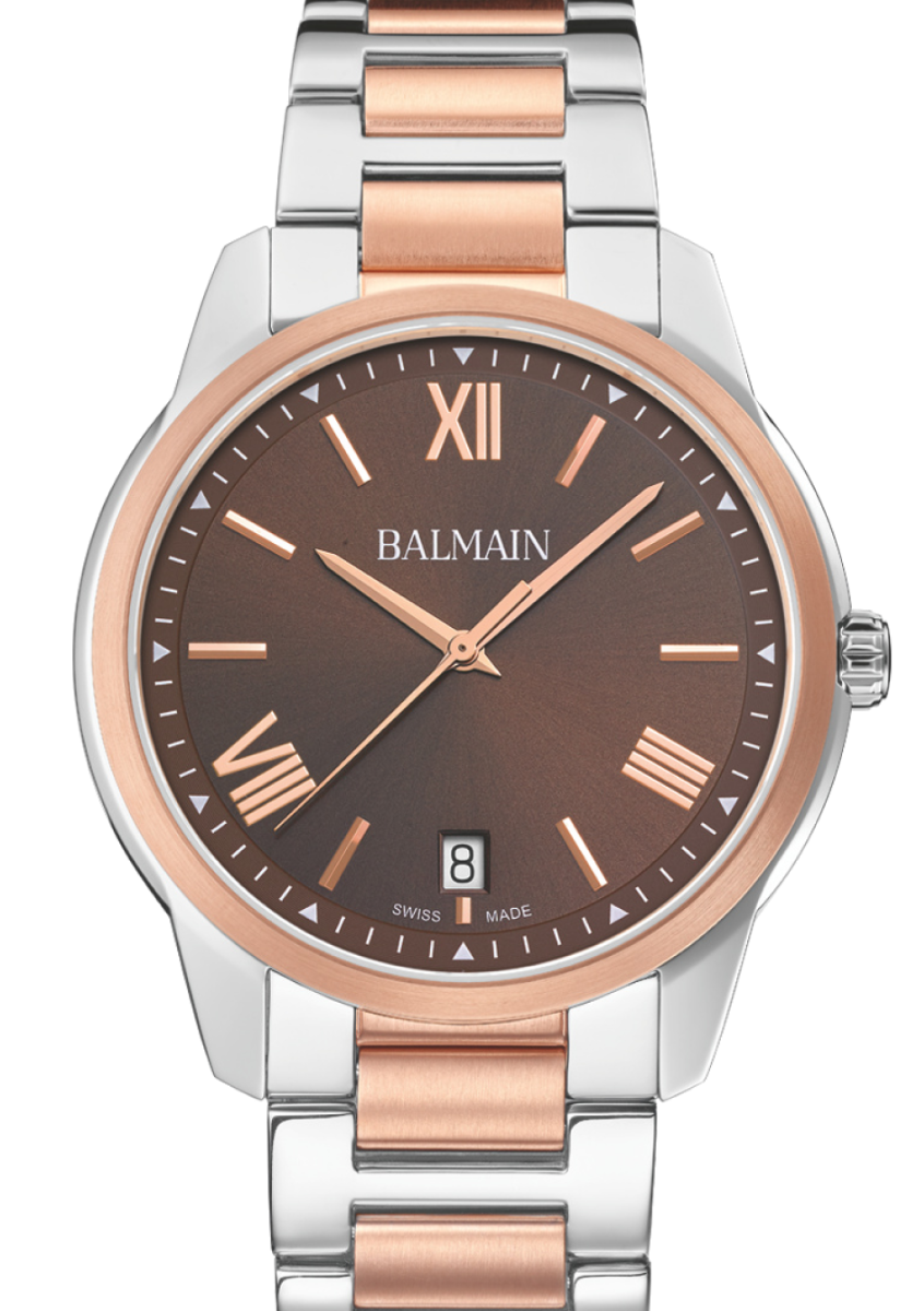 La Balmain Madrigal est une montre pour homme gracieuse qui allie une élégance délicate à un design moderne inspiré de la haute couture parisienne. à un design moderne inspiré de la Haute Couture parisienne. Son cadran brun chocolat chocolat avec des chiffres romains modernes apporte une touche expressive. Le boîtier bicolore de 40 mm bicolore en acier inoxydable et PVD or rose de 40 mm, avec un profil robuste de 7,43 mm et un bracelet assorti, offre un style intemporel au quotidien. bracelet assorti offre un style intemporel au quotidien. Ce garde-temps Swiss Made est doté d’un verre saphir.