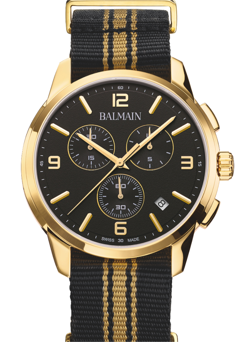 La Balmain Madrigal est une élégante montre pour homme qui allie le raffinement à un design moderne inspiré de la haute couture parisienne. moderne inspiré de la Haute Couture parisienne. Son cadran noir avec trois compteurs et compteurs et chiffres arabes apporte une touche expressive, tandis que le boîtier en or jaune PVD de 42 mm, avec un profil fin de 10,36 mm et un cadran en nid d’abeille PVD or jaune de 42 mm avec un profil fin de 10,36 mm et un bracelet nato noir et doré, offre une sophistication quotidienne. offre une sophistication de tous les jours. Ce garde-temps Swiss Made est doté d’un verre saphir.