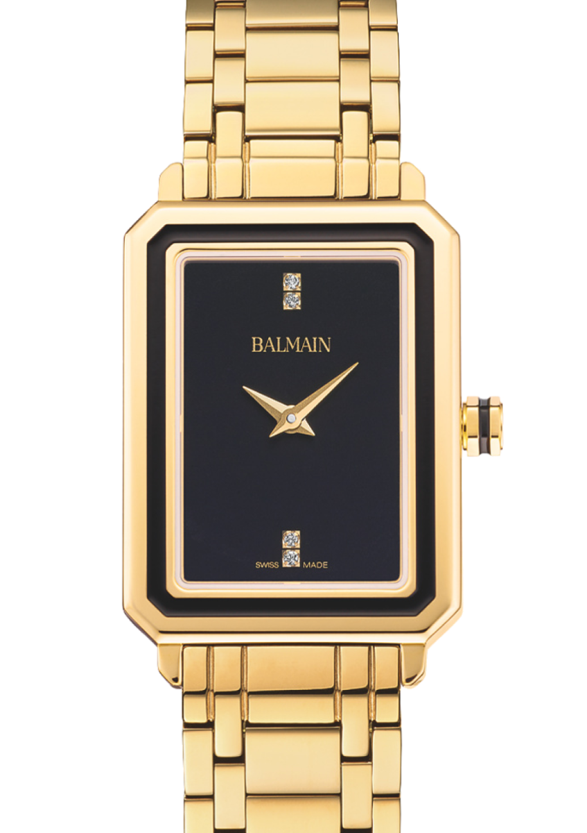 L’Eirini de Balmain est une gracieuse montre pour femme qui allie une élégance audacieuse à un design moderne inspiré de la haute couture parisienne. moderne inspiré de la haute couture parisienne. Son cadran noir serti de 4 diamants Top Wesselton VS-SI d’une valeur totale de 0,014 carat et sans chiffres, apporte une touche expressive. Le boîtier en PVD or jaune de 25 x 33 mm, au profil fin de 6,85 mm, et le bracelet en PVD or jaune offrent un raffinement quotidien. Ce garde-temps de fabrication suisse est doté d’un verre saphir.