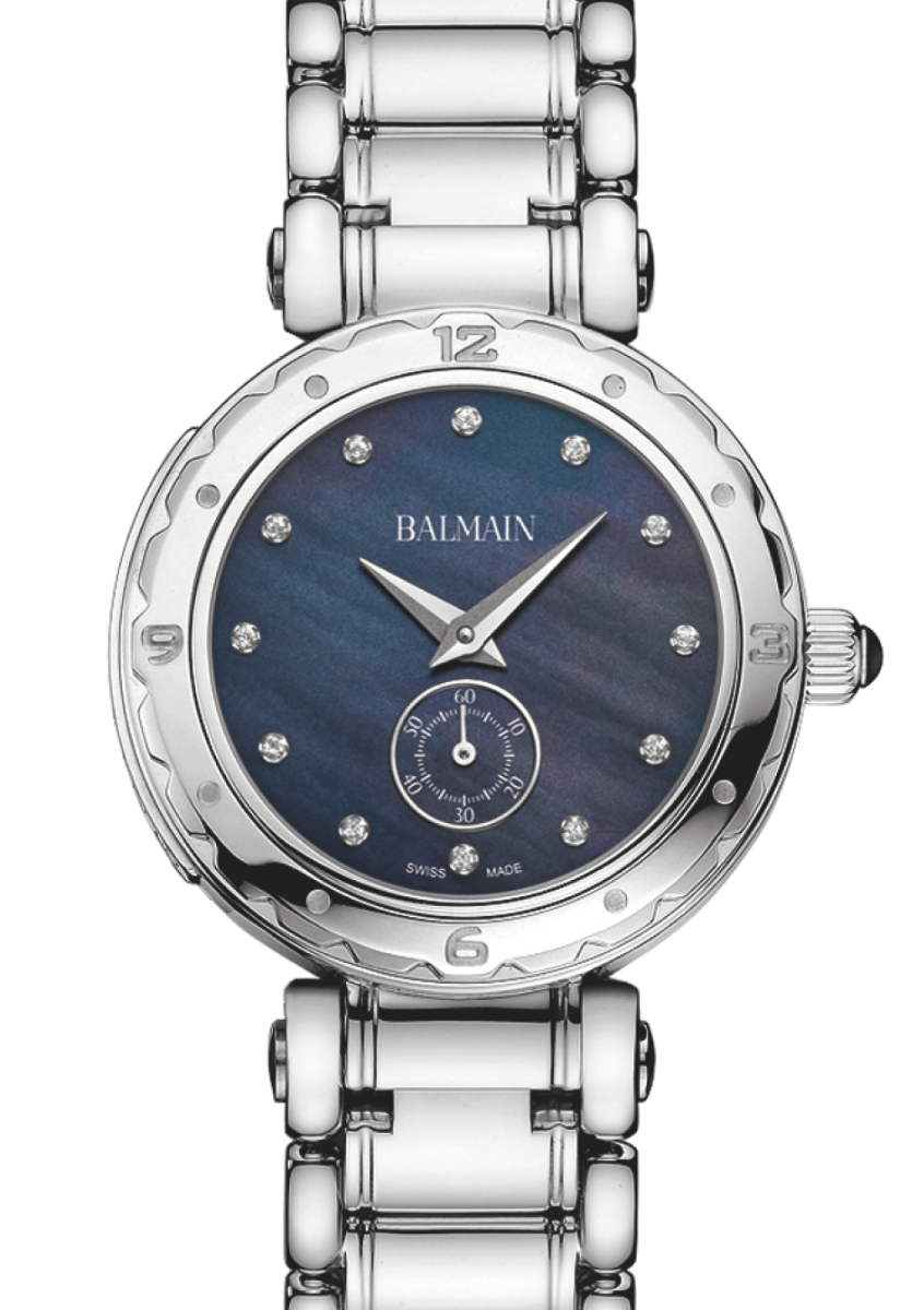 La Balmain Balmainia est une montre artistique pour femme qui allie l’élégance intemporelle à un design moderne inspiré de la haute couture parisienne. avec un design moderne inspiré de la Haute Couture parisienne. Son cadran en nacre nacre noire avec un petit compteur est serti de 12 diamants Top Wesselton VS-SI totalisant 0,043 carat. Le boîtier de 32 mm en acier inoxydable avec un profil raffiné de 8,45 mm et un bracelet en acier inoxydable offre une sophistication de tous les jours. Ce garde-temps Swiss Made est doté d’un verre saphir.
