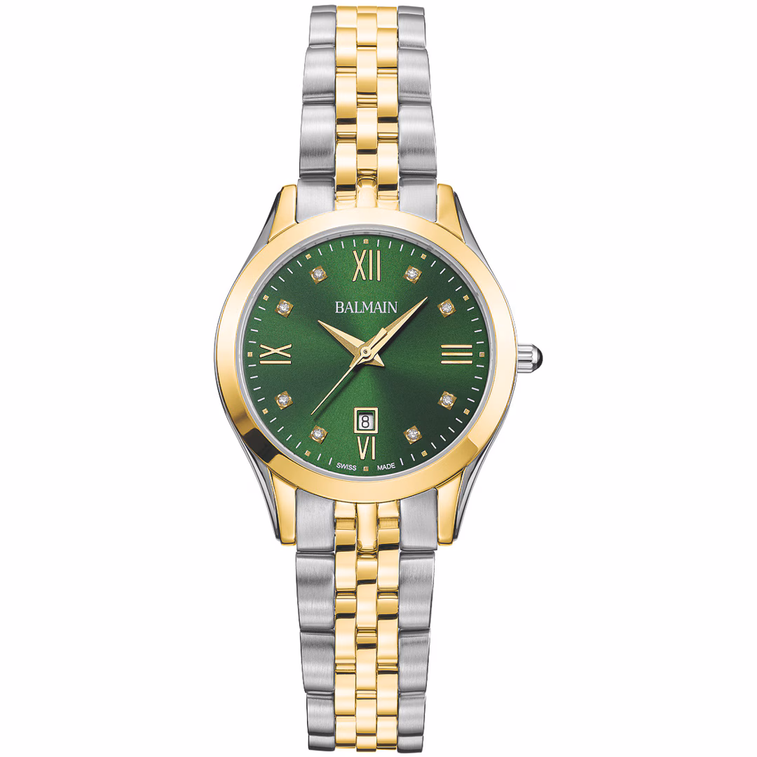 La Balmain Classic R est une montre féminine raffinée alliant un style radieux à un design moderne inspiré de la Haute Couture parisienne. Son cadran vert profond, serti de 8 diamants Top Wesselton VS-SI totalisant 0,030 carat et de chiffres romains classiques, lui confère une touche féminine et gracieuse. Son boîtier de 30 mm en acier inoxydable bicolore et PVD or jaune, d’un profil élégant de 6,50 mm, offre une sophistication au quotidien. Ce garde-temps de fabrication suisse est doté d’un verre saphir.