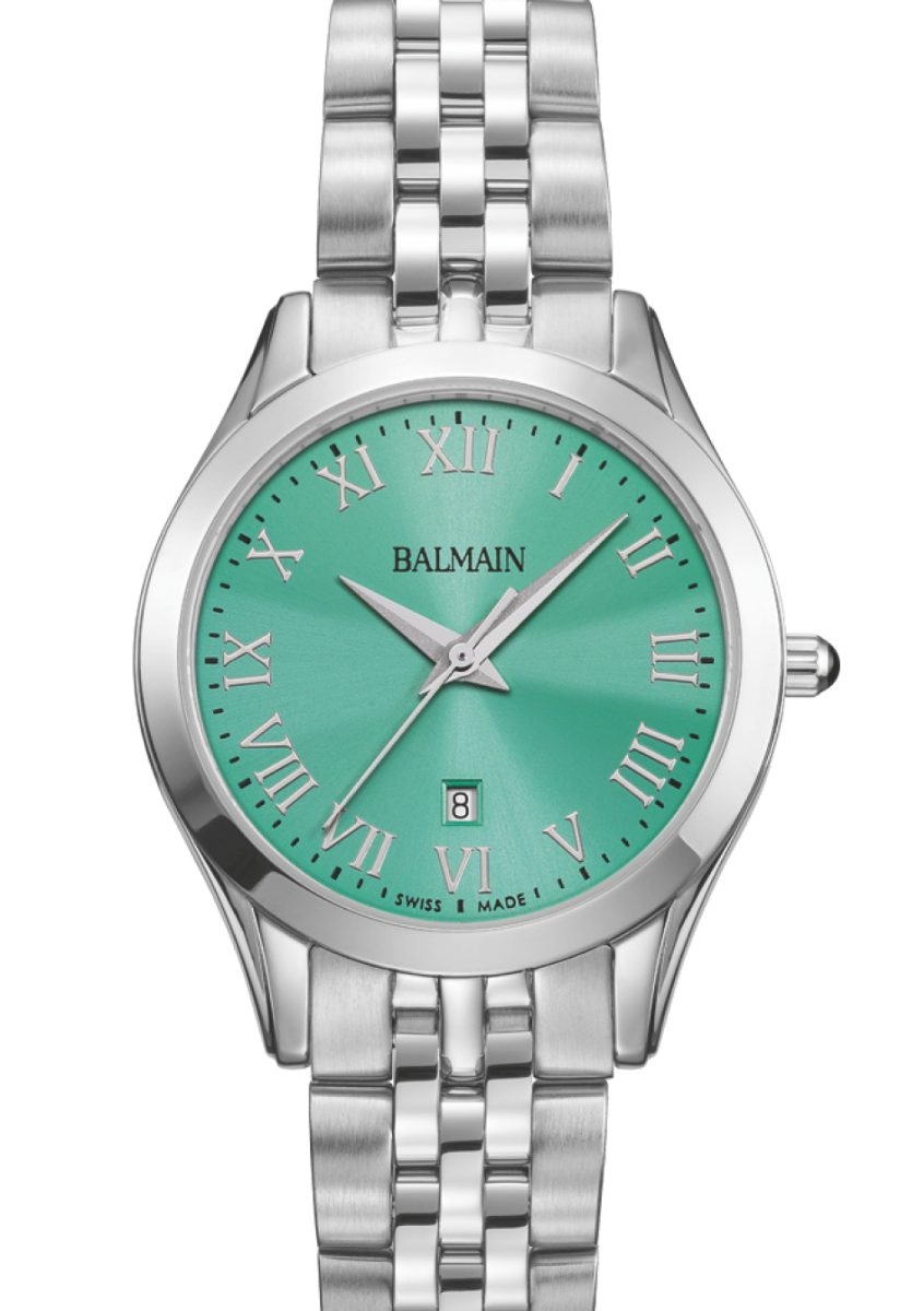 La Balmain Classic R est une montre féminine raffinée alliant élégance audacieuse et design moderne inspiré de la Haute Couture parisienne. Son cadran vert turquoise et ses chiffres romains classiques lui confèrent une touche vibrante et gracieuse, tandis que son boîtier en acier inoxydable de 30 mm, son profil élégant de 6,50 mm et son bracelet assorti offrent une sophistication au quotidien. Ce garde-temps de fabrication suisse est doté d’un verre saphir.