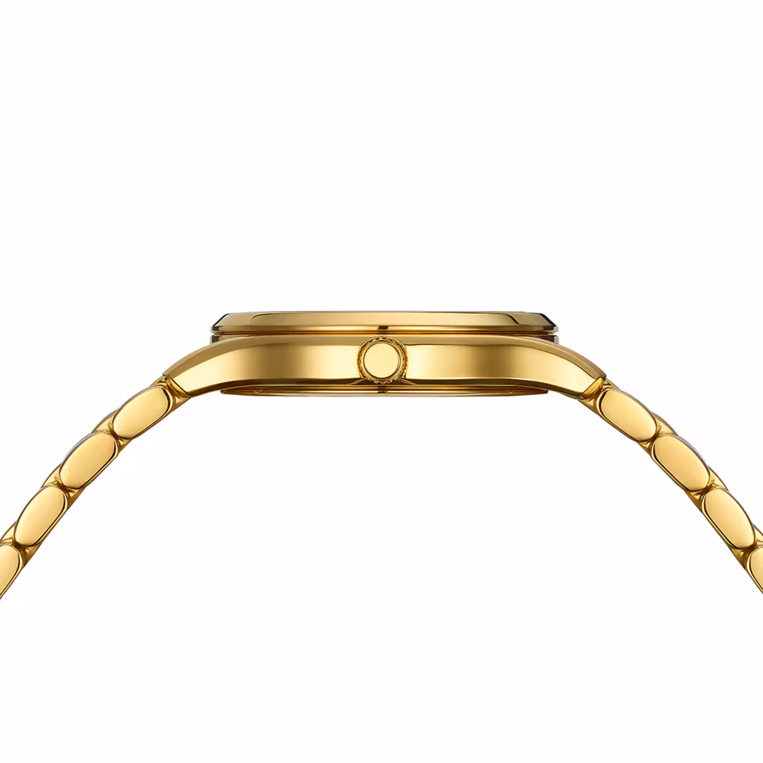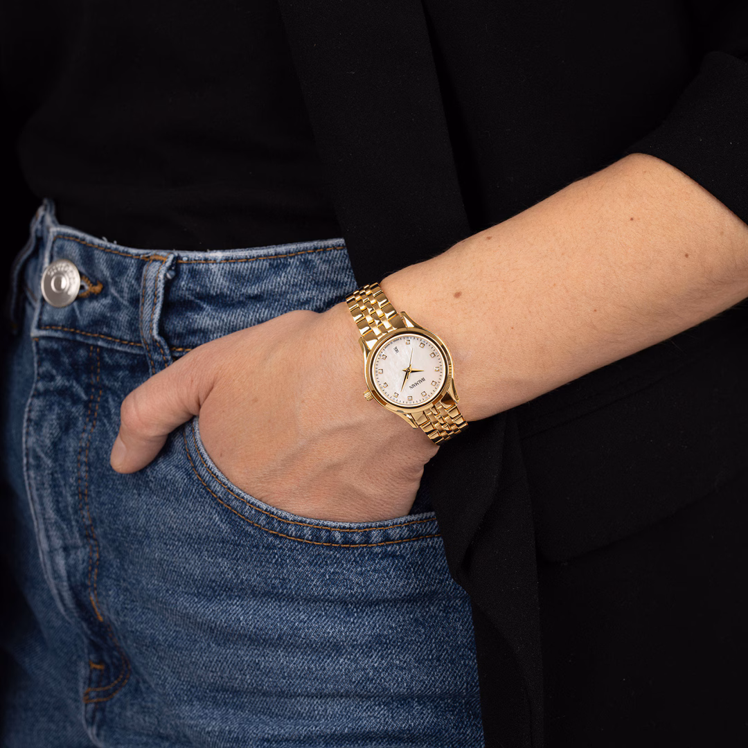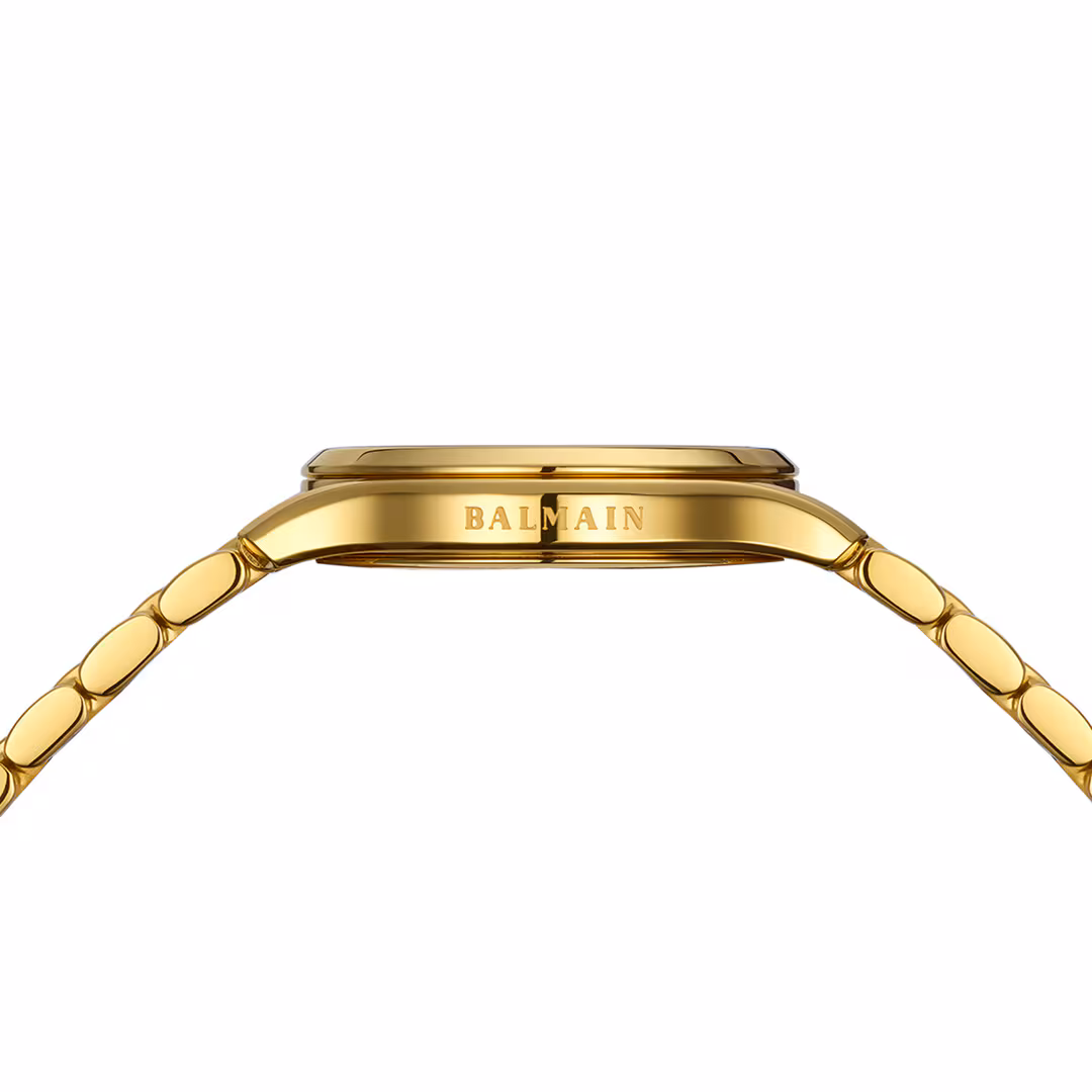 La Balmain Beleganza est une élégante montre pour femme alliant un design délicat à l’esprit de la Haute Couture parisienne. Son cadran en nacre blanche, serti de 11 diamants Top Wesselton VS-SI totalisant 0,041 carat et de chiffres en diamants, apporte une touche féminine. Son boîtier de 27,50 mm en or jaune PVD, avec un profil fin de 6,40 mm et un bracelet en or jaune PVD, offre une élégance au quotidien. Ce garde-temps de fabrication suisse est doté d’un verre saphir.