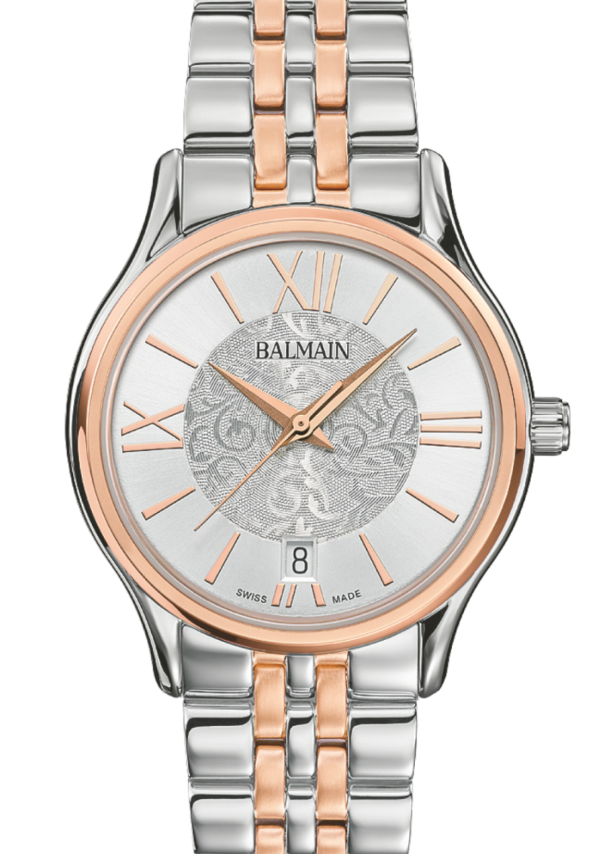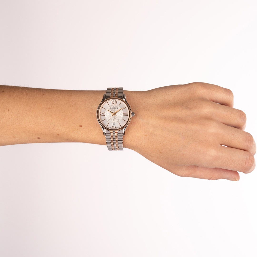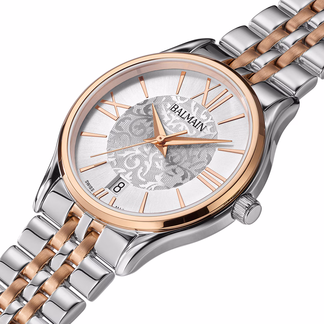 La Balmain Beleganza est une montre féminine raffinée alliant délicatesse et design moderne inspiré de la Haute Couture parisienne. Son cadran blanc à arabesques et ses chiffres romains classiques lui confèrent une touche vibrante. Son boîtier bicolore de 32 mm en acier inoxydable et PVD or rose, doté d’un profil robuste de 6,27 mm et d’un bracelet assorti, offre un raffinement au quotidien. Ce garde-temps de fabrication suisse est doté d’un verre saphir.