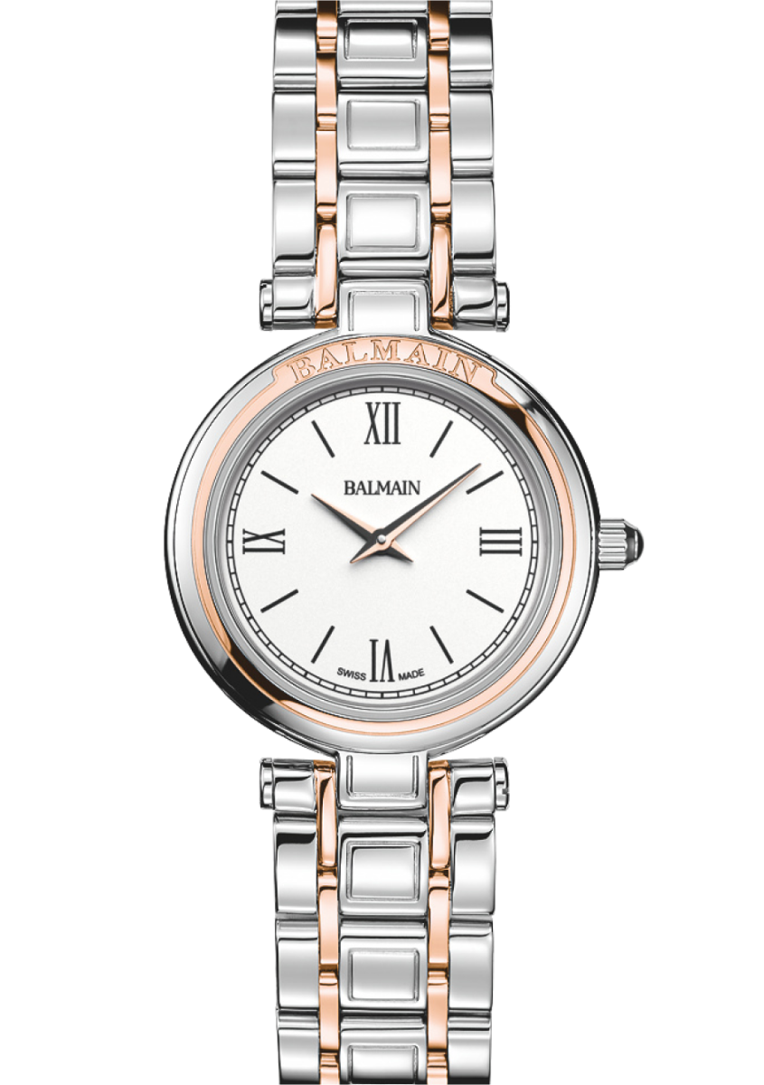 La Balmain Haute Élégance est une montre élégante pour femme alliant audace et design moderne inspiré de la Haute Couture parisienne. Sa lunette gravée « Balmain » et son cadran blanc à chiffres romains classiques lui confèrent une touche féminine. Son boîtier de 24 mm en acier inoxydable bicolore et PVD or rose, avec son profil élégant de 4,95 mm et son bracelet assorti, offre une allure élégante au quotidien. Fabriquée en Suisse, cette montre est dotée d’un verre saphir.