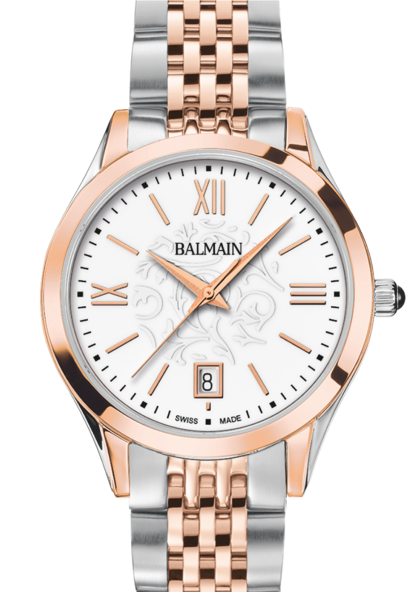 La Balmain Classic R est une montre féminine artistique alliant élégance délicate et design moderne inspiré de la Haute Couture parisienne. Son cadran à arabesques blanches et ses chiffres romains classiques lui confèrent une touche expressive, tandis que son boîtier de 34 mm en acier inoxydable bicolore et PVD or rose, doté d’un profil élégant de 6,80 mm et d’un bracelet assorti, offre un raffinement au quotidien. Ce garde-temps de fabrication suisse est doté d’un verre saphir.