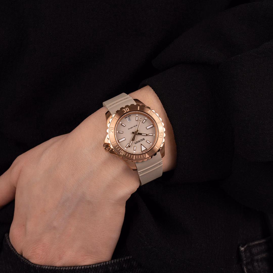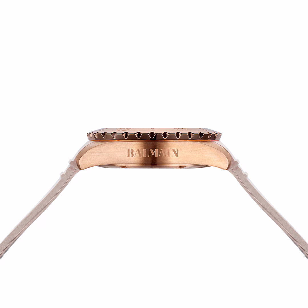 La Balmain Ophrys Lady est une montre pour femme au style sport-chic, dotée d’un magnifique cadran beige sable et d’un bracelet en caoutchouc assorti, embossé du logo Balmain. Son boîtier compact de 34,50 mm en PVD ou rose et son le profil de 10 mm offre un port élégant et confortable. étanche jusqu’à 200 mètres et équipé d’index en Super-LumiNova®, elle allie fonctionnalité inspirée des montres de plongée et style estival raffiné.