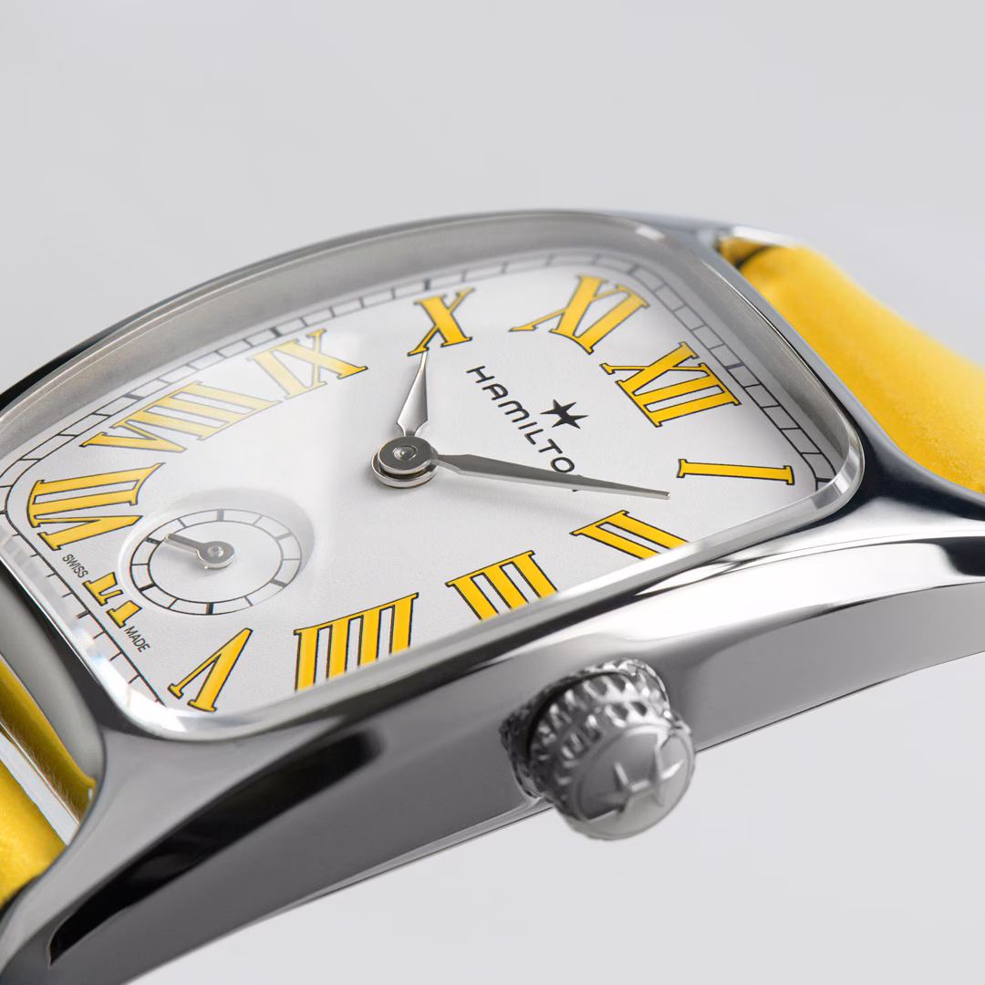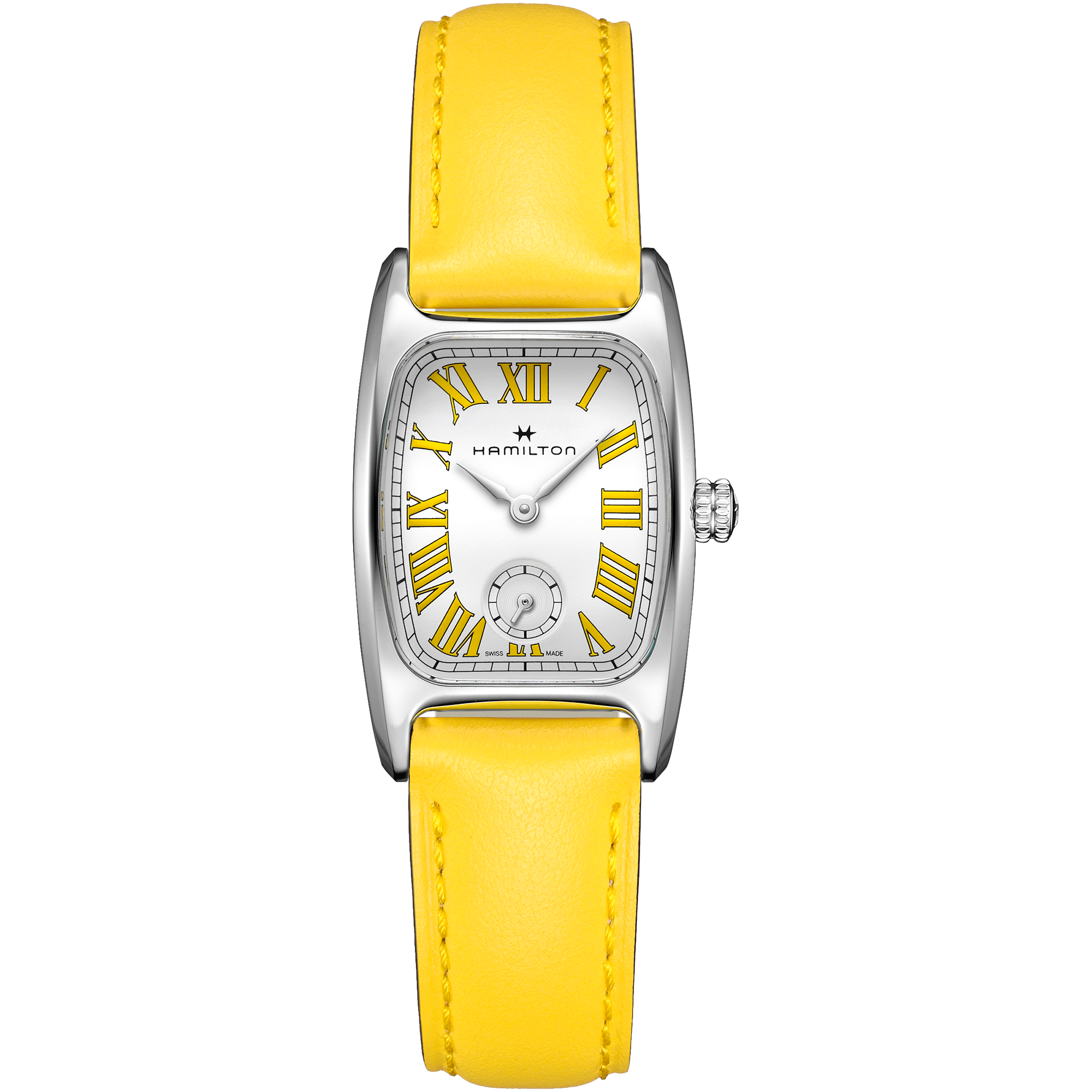 Avec son boîtier aux courbes délicates et son design Art Déco caractéristique, la montre Hamilton Boulton M se décline désormais dans une gamme de couleurs vives inspirée par les parfums des macarons. Le splendide cadran blanc nacré, ponctué de chiffres romains, est sublimé par un bracelet en cuir jaune citron assorti. Déclinée dans une palette de couleurs qui mettent l’eau à la bouche, la montre Hamilton Boulton est une véritable petite douceur horlogère. Mariant avec brio l’ancien et le nouveau, cette montre exhale un parfum de féminité à la fois vivifiant et intemporel.