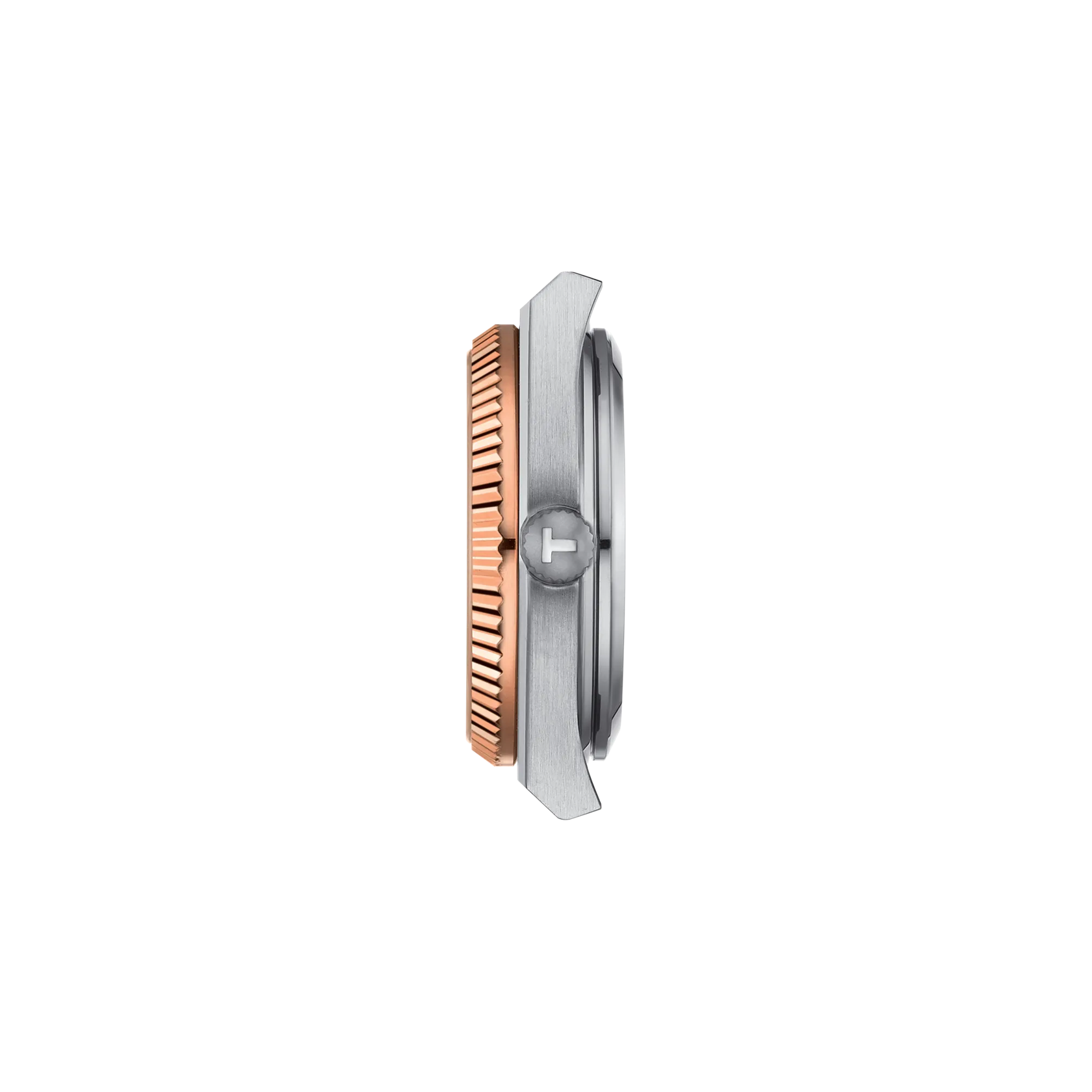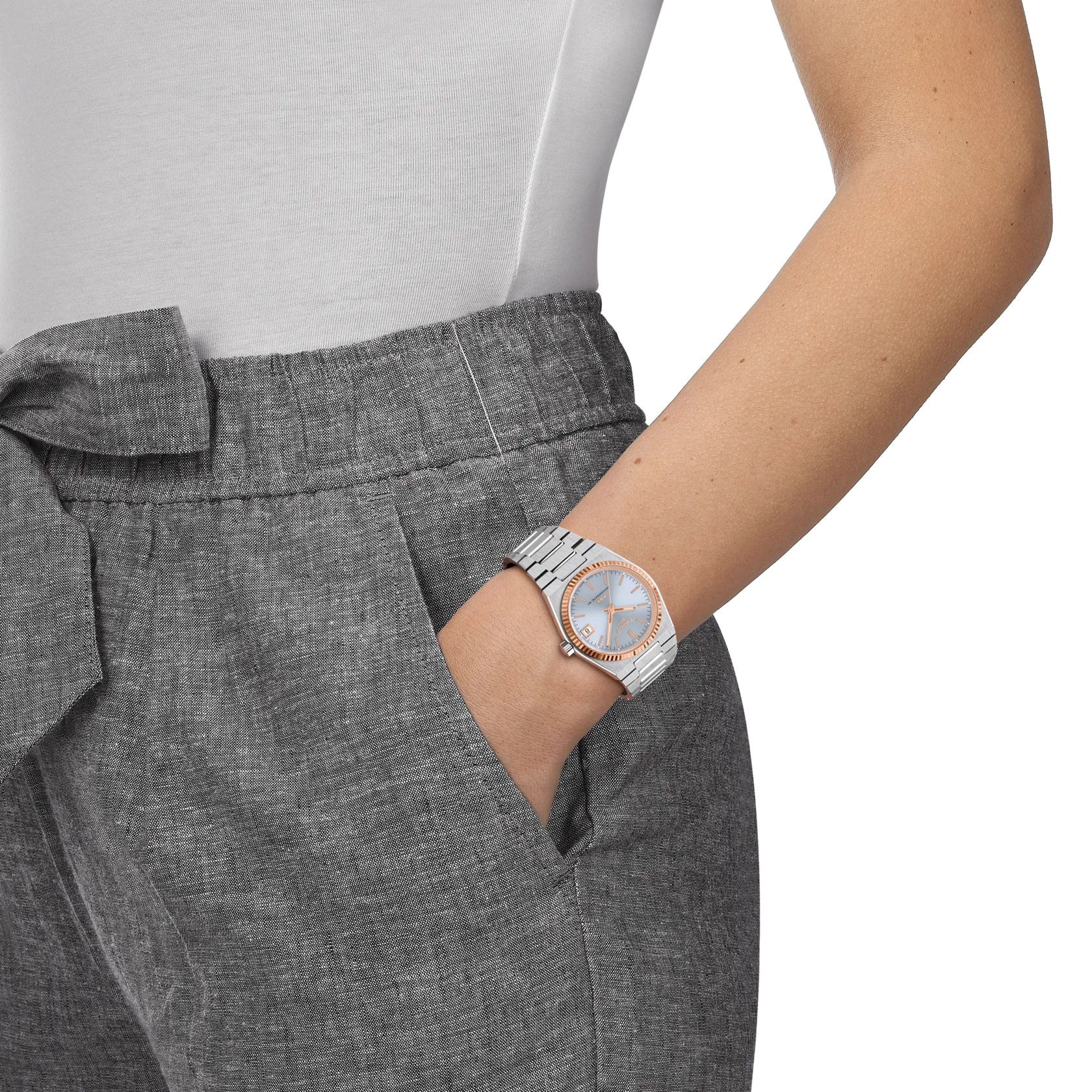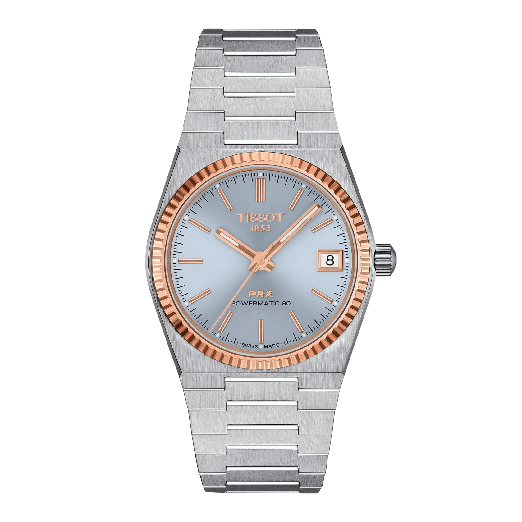 Cette nouvelle PRX a un boîtier en acier inoxydable 316L de 35 mm. La montre Tissot PRX Powermatic 80 acier & or 18 carats est équipée d’une lunette cannelée en or véritable 18 carats rose qui – avec les index et les aiguilles de même couleur – forme un beau contraste avec le cadran couleur bleu glacier.